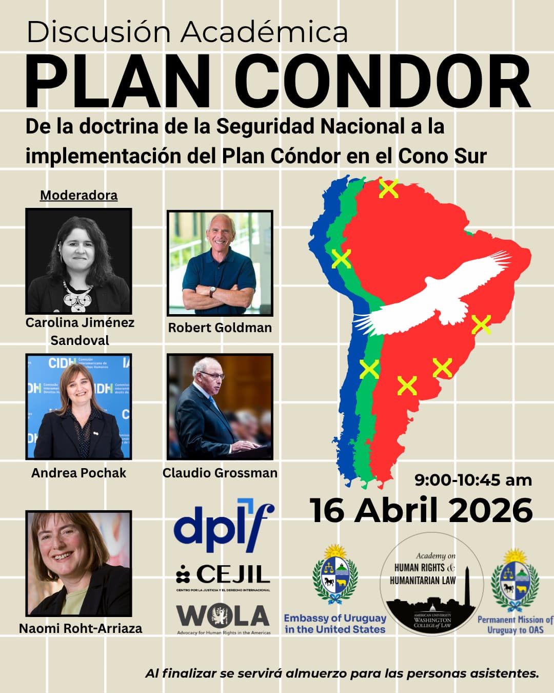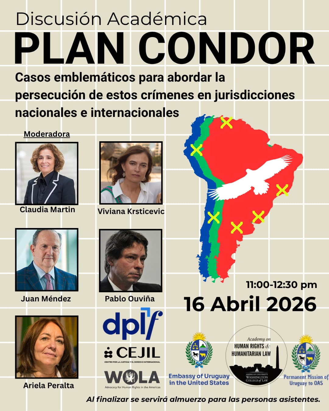 La Academia de Derechos Humanos y Derecho Internacional Humanitario de American University Washington College of Law organizará, junto con la Embajada de Uruguay en los Estados Unidos y la Misión de Uruguay ante la Organización de los Estados Americanos (OEA), así como el Washington Office on Latin America (WOLA), el Centro por la Justicia y el Derecho Internacional (CEJIL) y la Due Process of Law Foundation (DPLF), una conferencia el próximo 16 de abril en conmemoración del 50.º aniversario del Plan Cóndor.