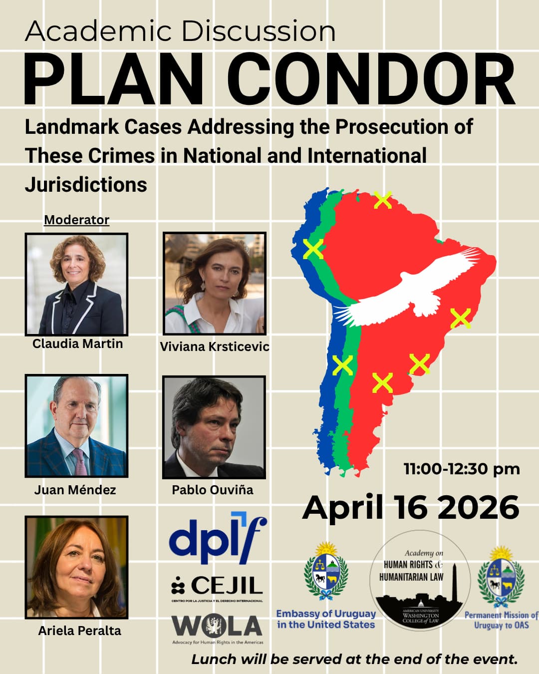 The Academy on Human Rights and Humanitarian Law at American University Washington College of Law will be hosting, together with the Embassy of Uruguay in the United States and the Mission of Uruguay to the Organization of American States (OAS), as well as the Washington Office on Latin America (WOLA), the Center for Justice and International Law (CEJIL), and the Due Process of Law Foundation (DPLF), a conference on April 16 commemorating the 50th anniversary of Operation Condor.