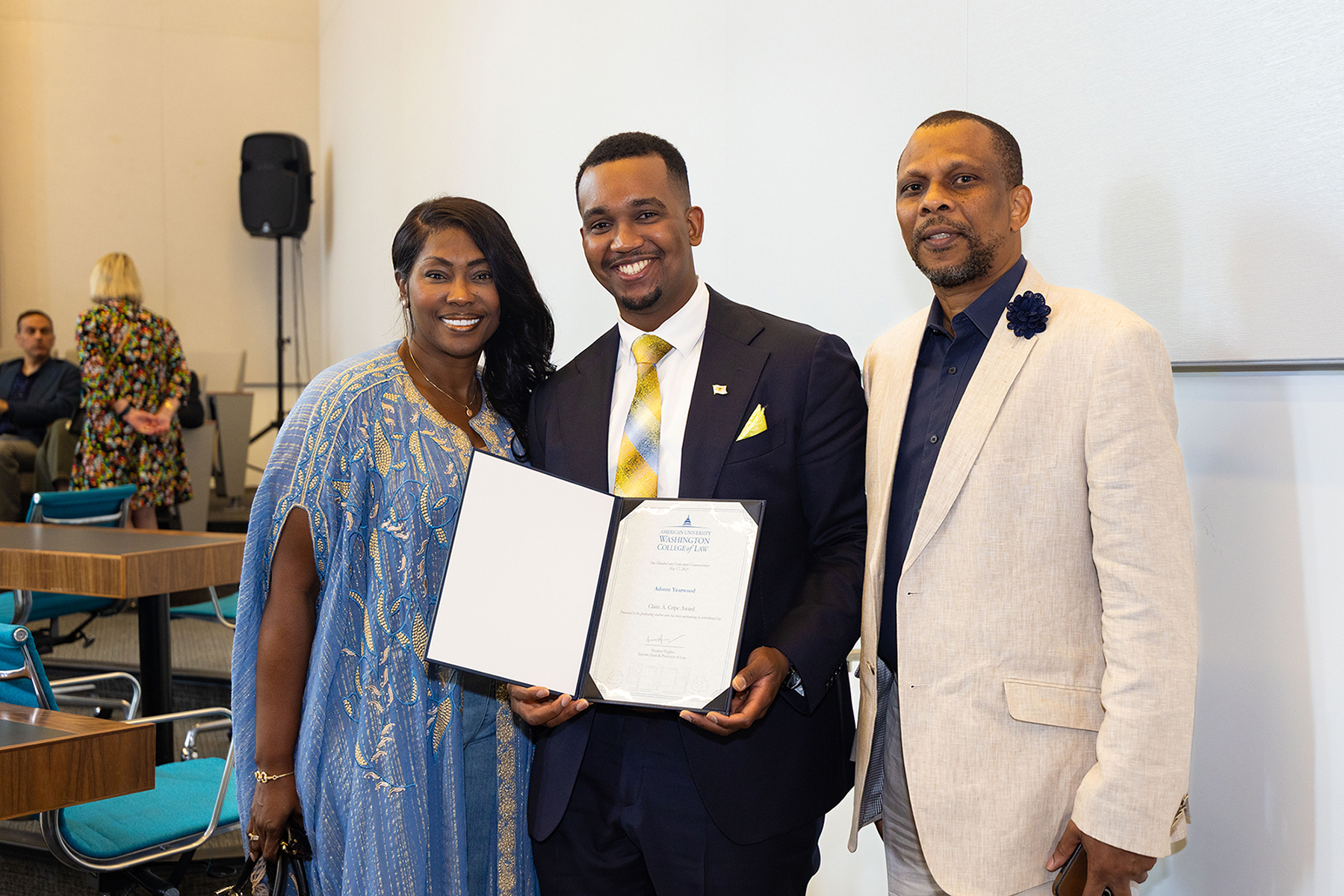 Adonte Yearwood displays his award - Victoria Maamari received the Pro Bono Excellence Award for a graduating student who has contributed the most hours to pro bono service during their time at WCL with 800 hours